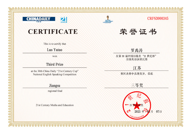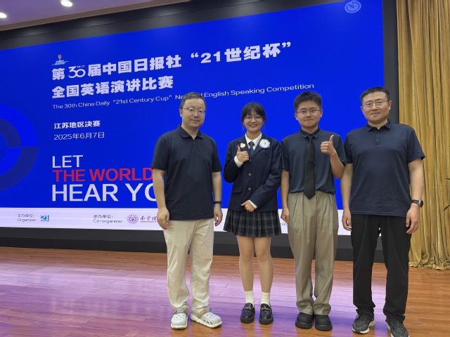 6月7日,第30届中国日报社“21世纪杯”全国英语演讲比赛江苏省赛决赛在南京理工大学圆满落幕。公司选派两名优秀学子参赛,凭借出色的英语表达能力、严密的逻辑思维能力、迅速现场反应力及出色的舞台表现力,beat365亚洲体育官方网站金奕彤同学在来自南京大学、东南大学、南京理工大学等全省80名优秀参赛选手的激烈竞争中脱颖而出,荣获江苏省一等奖,顺利晋级国赛,罗禹涛荣获江苏省三等奖。金奕彤同学作为优秀选手,接受21世纪报记者视频采访。