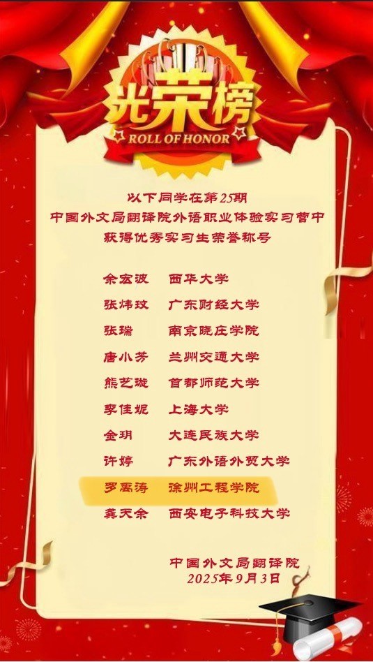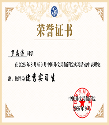在此次实习中,罗禹涛同学表现突出,被评为“优秀实习生”,充分展现了beat365亚洲体育官方网站员工在国际传播与翻译领域的潜力与能力。此次实习不仅是一次宝贵的学习经历,也为员工未来职业发展奠定了坚实基础。
